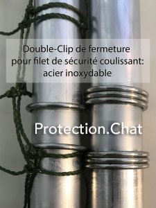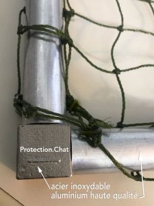 ⇒ un filet vert-sapin avec un renfort en fil d’acier inoxydable pour assurer la sécurité de l’ensemble. Le filet que nous utilisons depuis 2006 résistera à 99.99% des assauts (mordillements) de vos félins préférés.