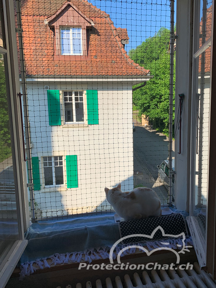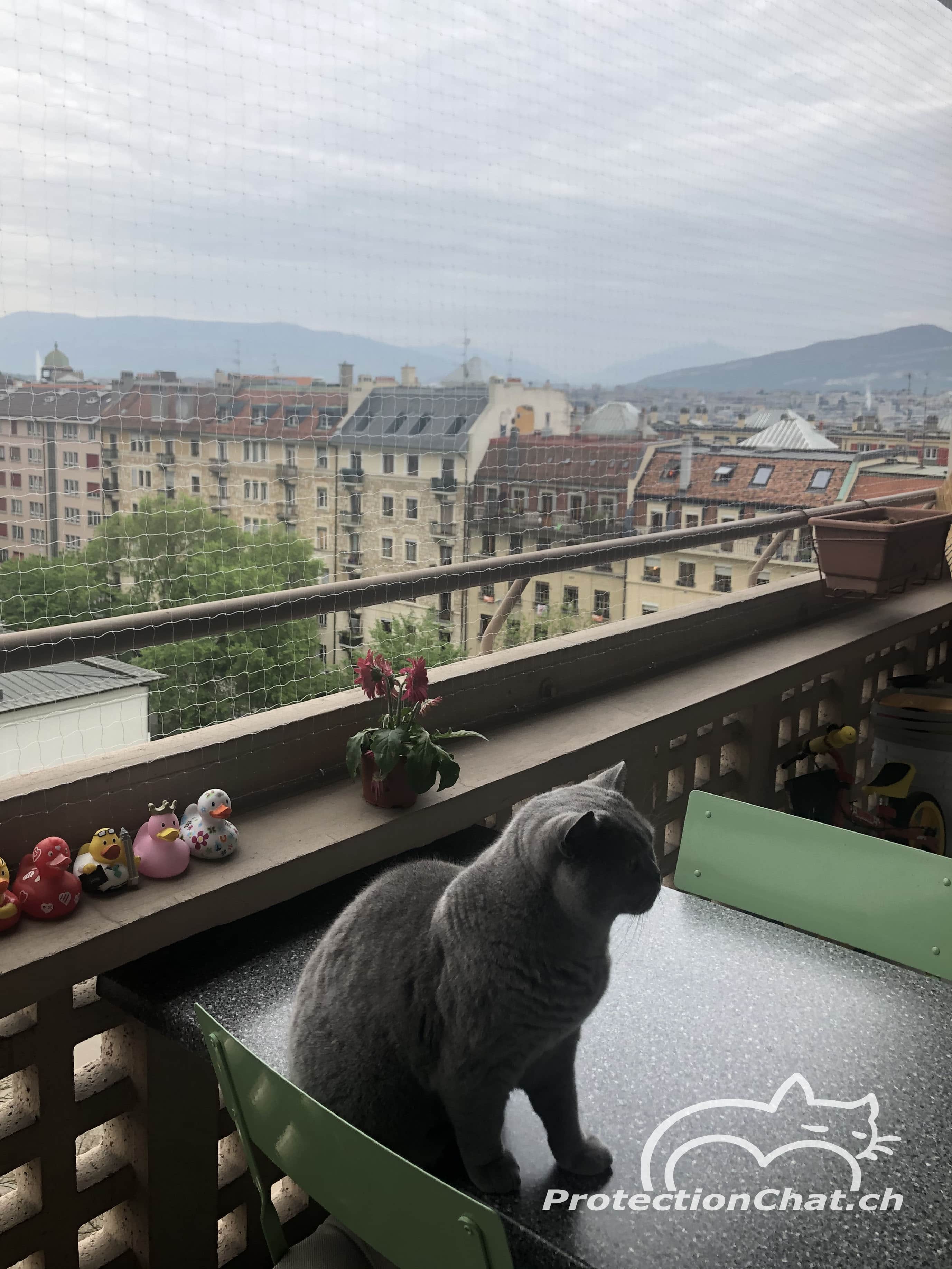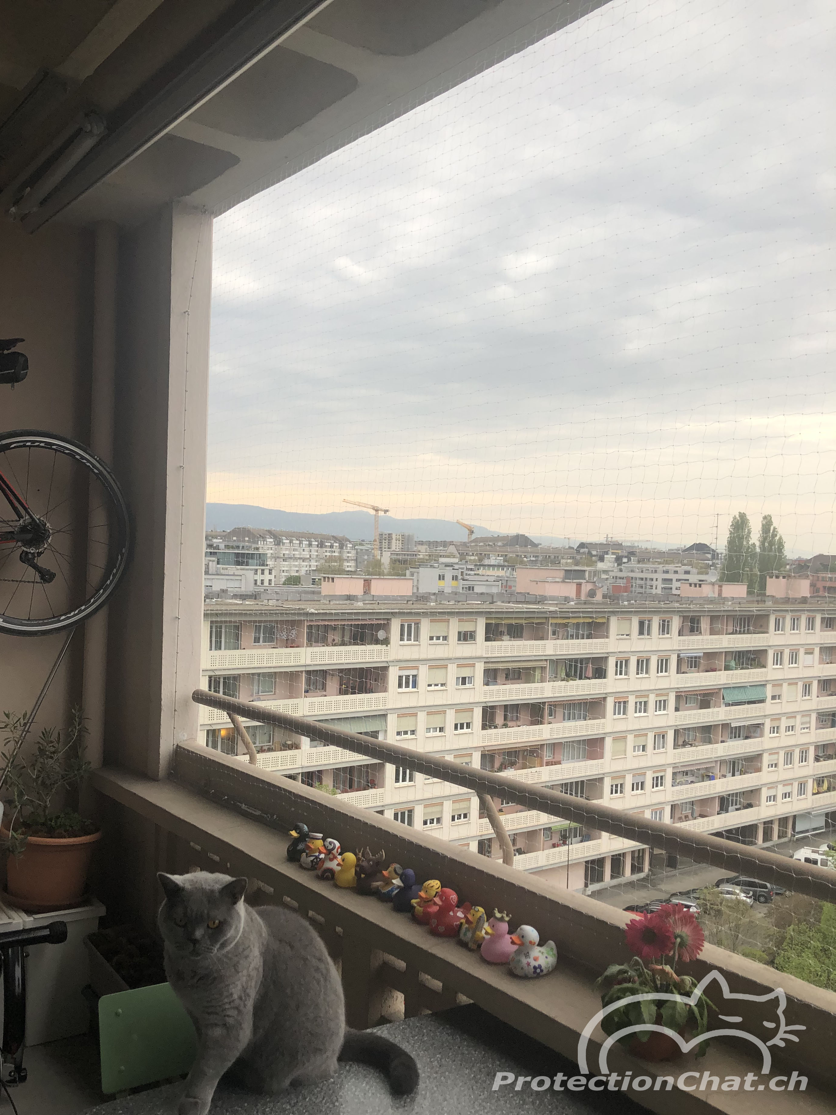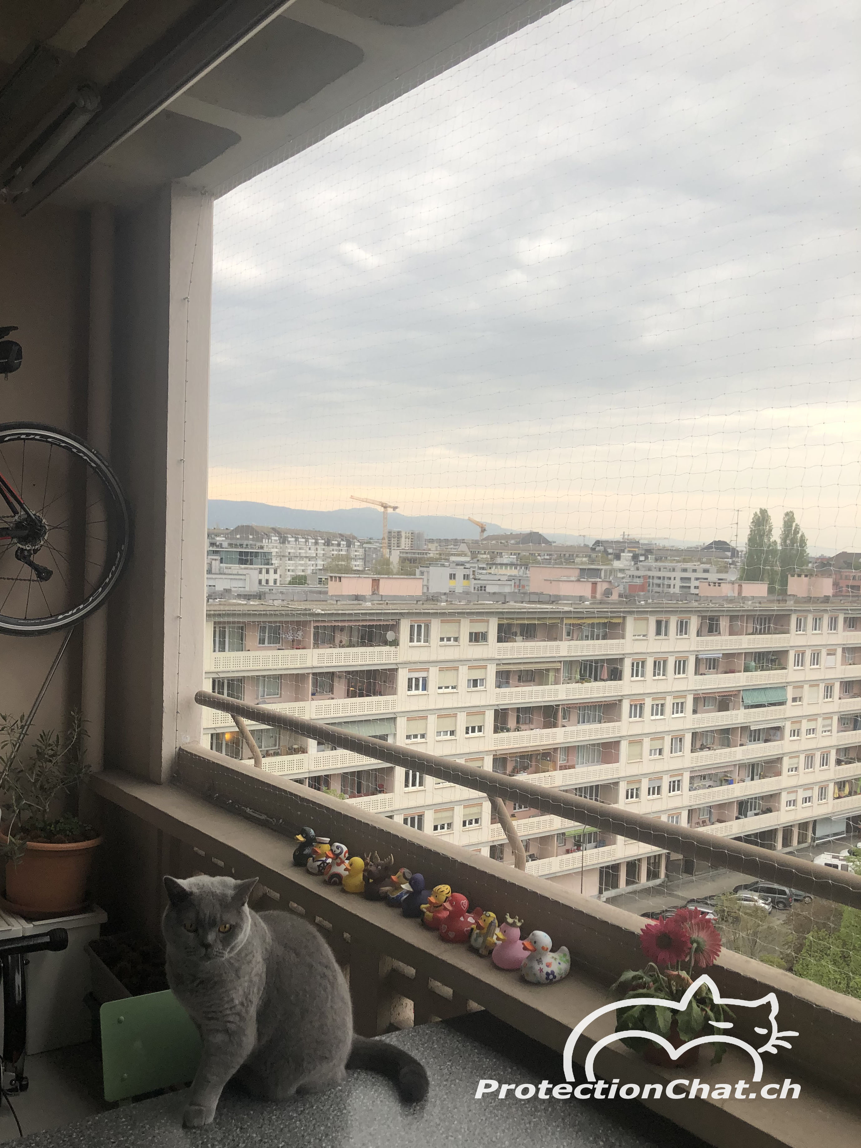 Voilà plus de 7 mois que ma petite Wictoria (Devon Rex) peut se promener en toute tranquilité sur le rebord de mon balcon. Elle a tout loisir de chasser du regard les oiseaux et petits insectes. J’ai choisi le filet transparant car je suis entourée de bâtiment et le filet ne se voit absolument pas à tel point que mes voisins d’en face venaient m’aviser qu’ils craignaient que ma petite tombe du balcon, surpris de constater qu’un filet la protégeait.