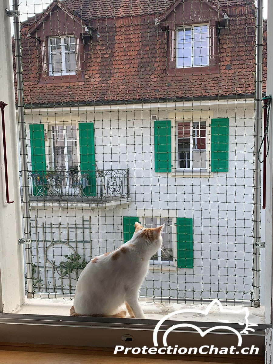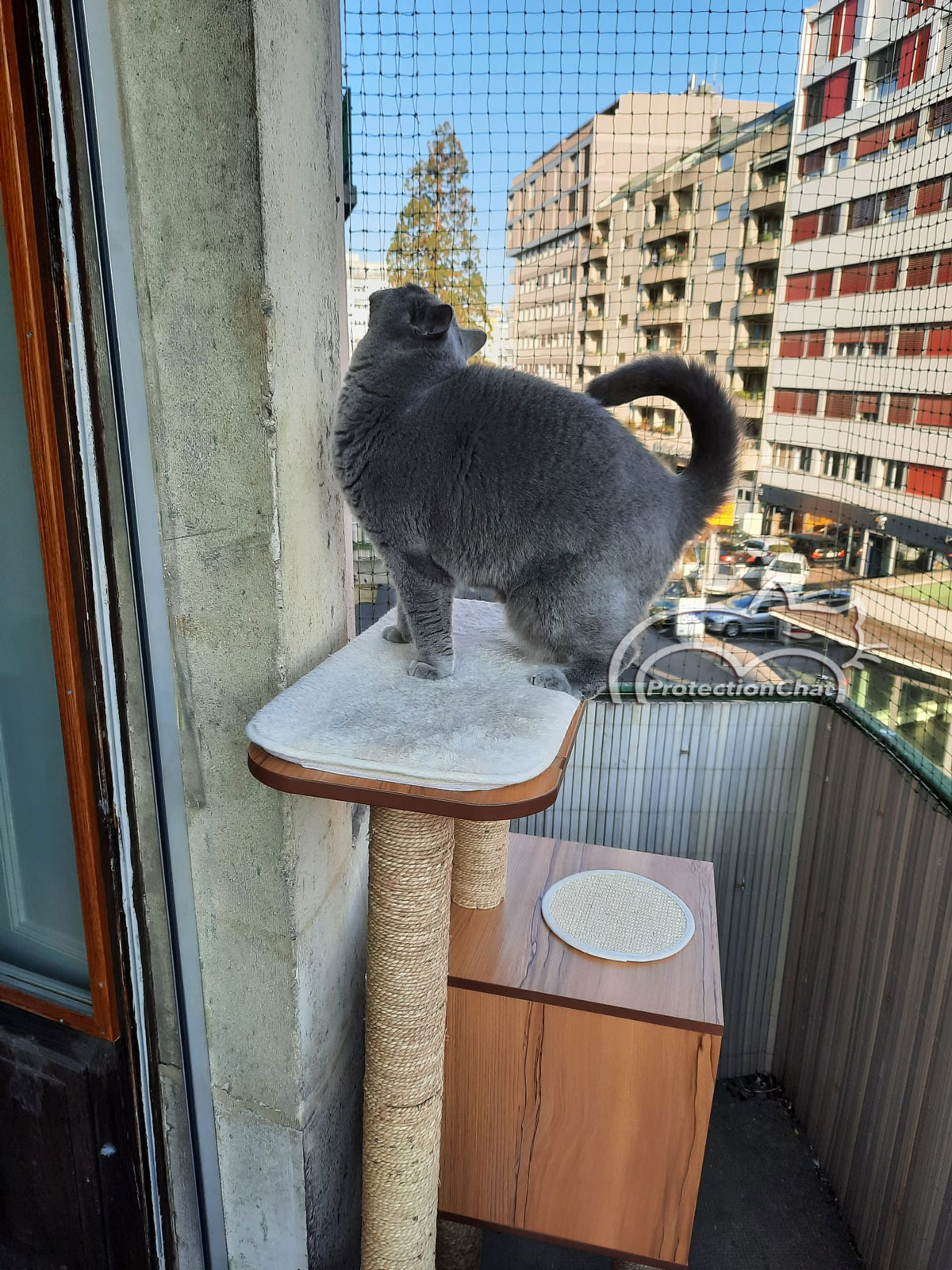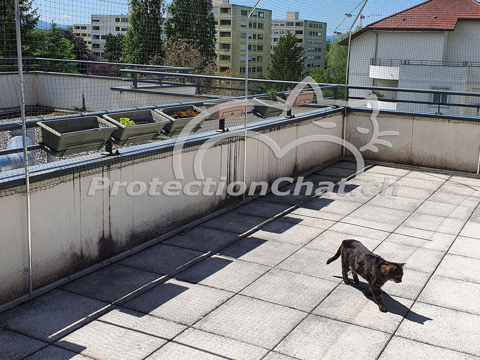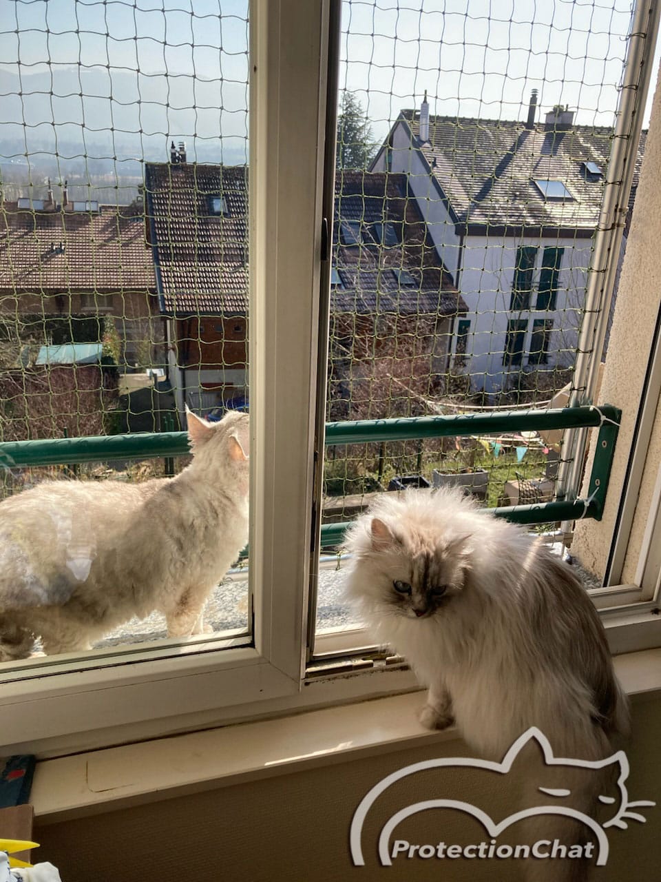Voilà plus de 7 mois que ma petite Wictoria (Devon Rex) peut se promener en toute tranquilité sur le rebord de mon balcon. Elle a tout loisir de chasser du regard les oiseaux et petits insectes. J’ai choisi le filet transparant car je suis entourée de bâtiment et le filet ne se voit absolument pas à tel point que mes voisins d’en face venaient m’aviser qu’ils craignaient que ma petite tombe du balcon, surpris de constater qu’un filet la protégeait.