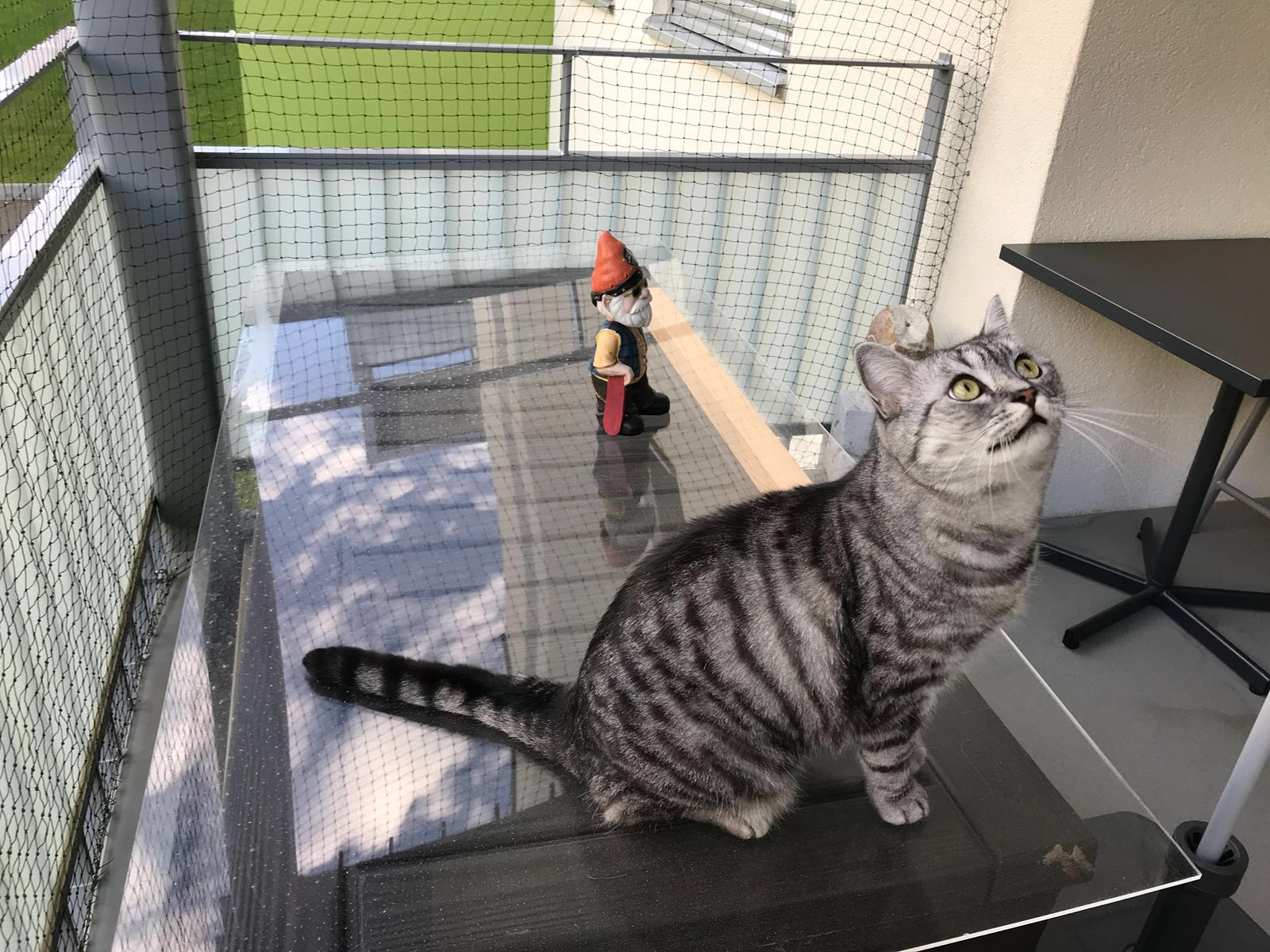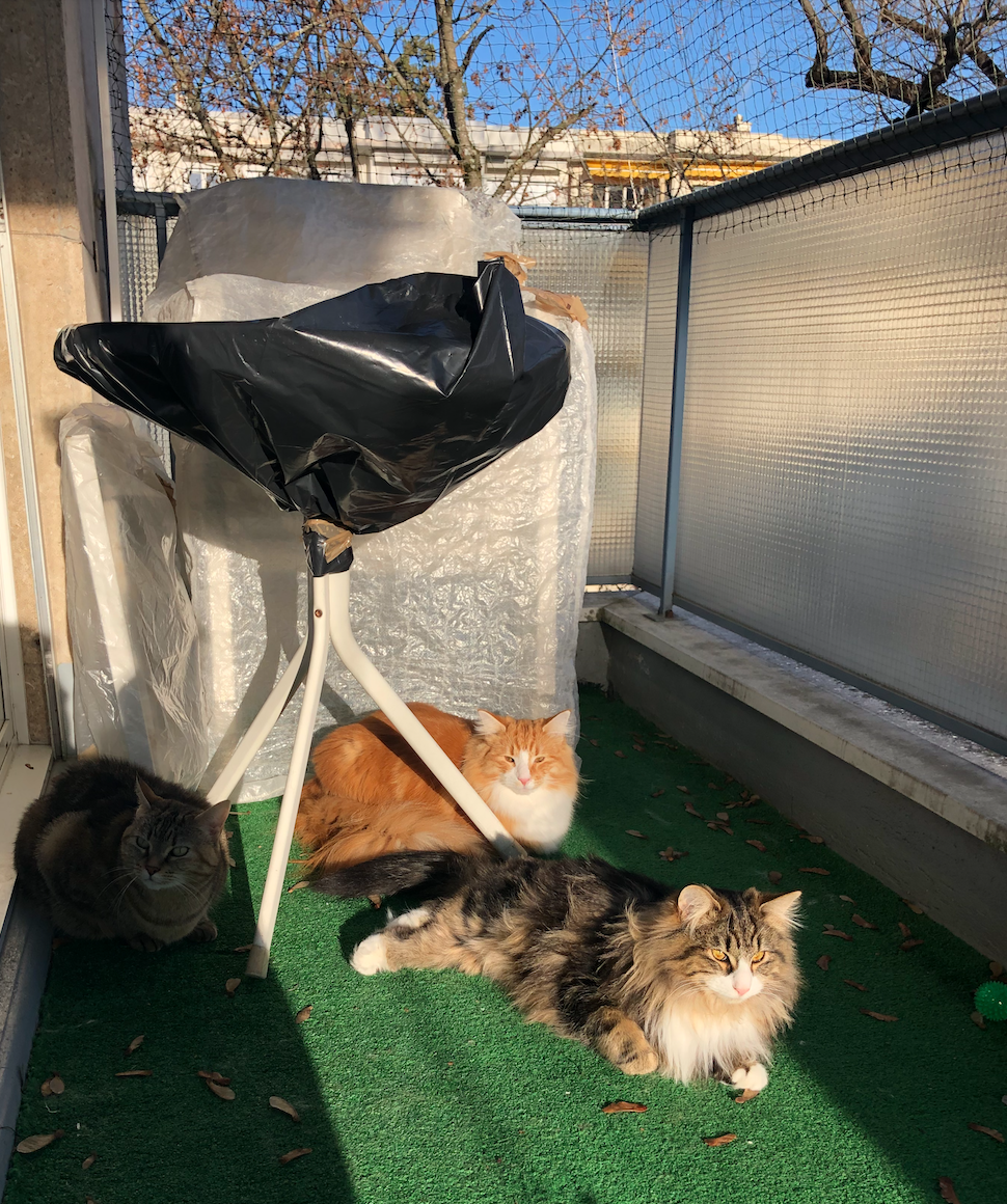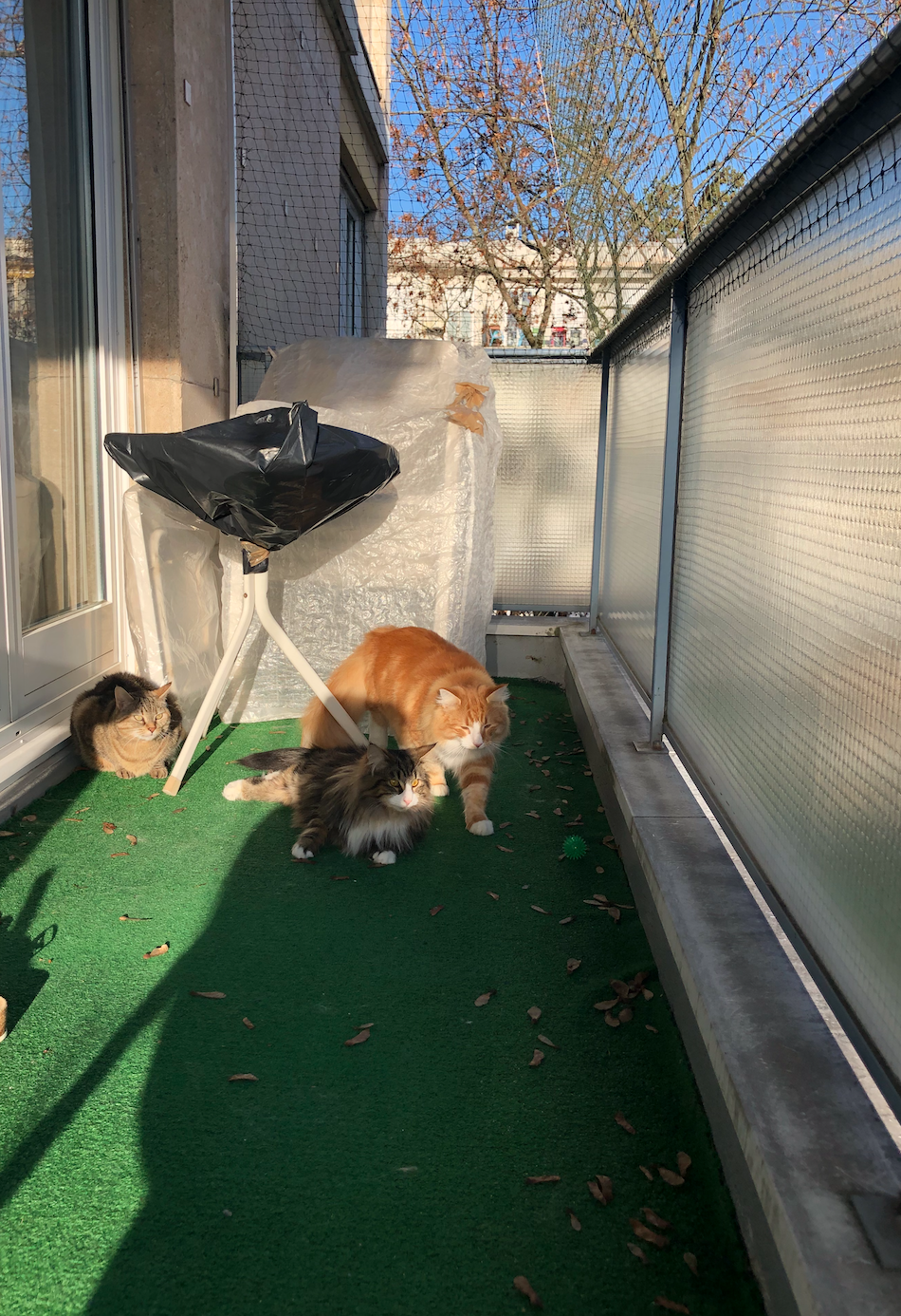 Je suis très contente du résultat, l’installation sur le balcon est bien réalisée. Mes chats sont enfin dehors, en train d’explorer et de renifler tous les recoins avec beaucoup de curiosité et d’enthousiasme. Ils approuvent eux aussi le travail !