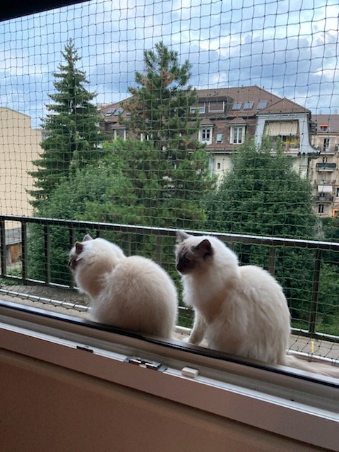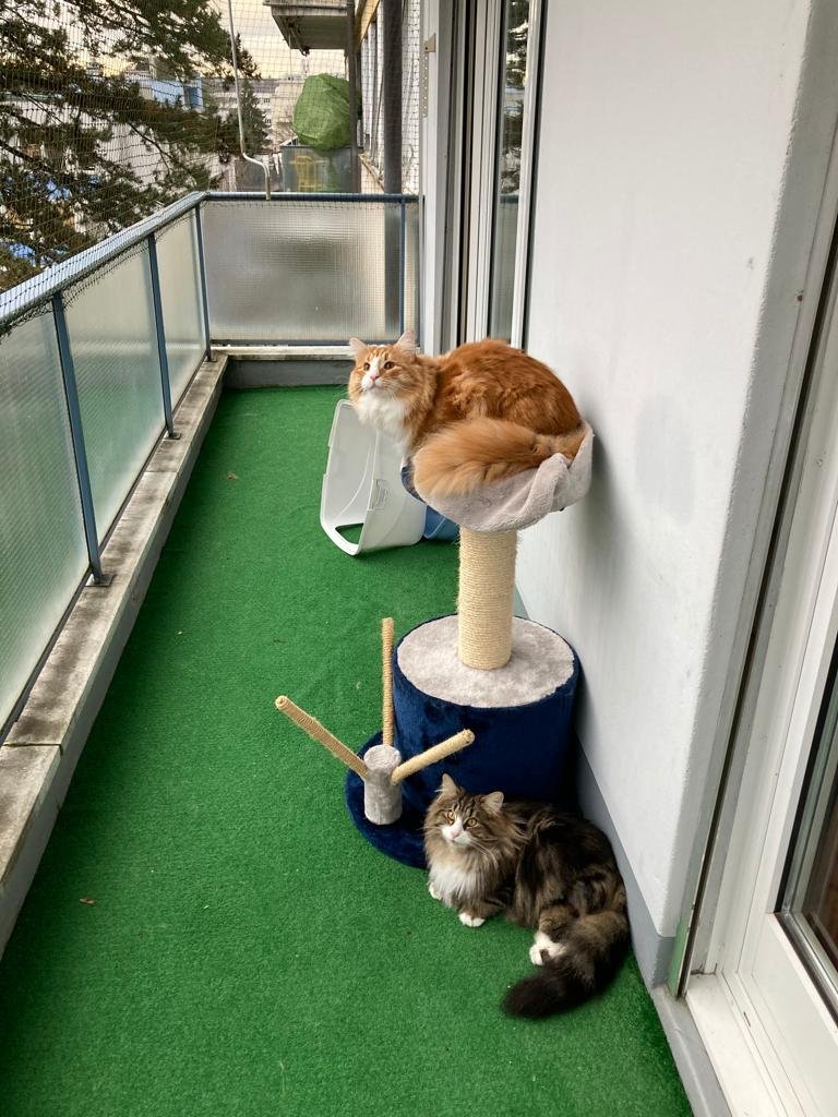 Je suis très contente du résultat, l’installation sur le balcon est bien réalisée. Mes chats sont enfin dehors, en train d’explorer et de renifler tous les recoins avec beaucoup de curiosité et d’enthousiasme. Ils approuvent eux aussi le travail !